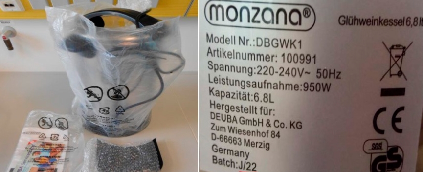 Konkrétne ide o varný kotol 6,8 l s obchodnou značkou Monzana, výr. č.: 4250525304275, iné označ.: 100991, Order: DB0470050, Batch: J/22 s krajinou pôvodu Čína.