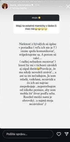 Kým s niektorými mamičkami vychádza Laura korektne, vraj ich nie je veľa, iné ju majú v zuboch a podľa jej slov by jej v tichosti závideli aj zápal dutín. ,,Pravda je, že ma nikdy nevedeli stráviť… a ani sa im nečudujem. Ja som mladá, vzdelaná, nezávislá a čo ich asi najviac znepokojuje… nepotrebujem od nikoho peniaze, aby som mohla žiť život podľa seba. Rozdiel medzi nami je obrovský a najmä moja nezávislosť,“ uviedla dvojnásobná mamina.