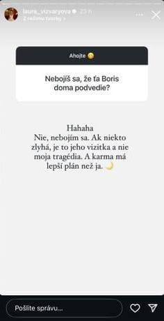 Jeden z influencerkiných sledovateľov sa jej na to opýtal v čase, keď so synmi dovolenkovala v Španielsku, zatiaľ čo Boris ostal doma v Bratislave. ,,Nie, nebojím sa. Ak niekto zlyhá, je to jeho vizitka a nie moja tragédia. A karma má lepší plán než ja,“ odpovedala Laura, čo svedčí o jej zdravom sebavedomí. To jej nechýba ani v súvislosti s Kollárovými expartnerkami – od väčšiny sa totiž líši zásadnou vecou. Nie je závislá od politikových peňazí a je si plne vedomá svojich kvalít.